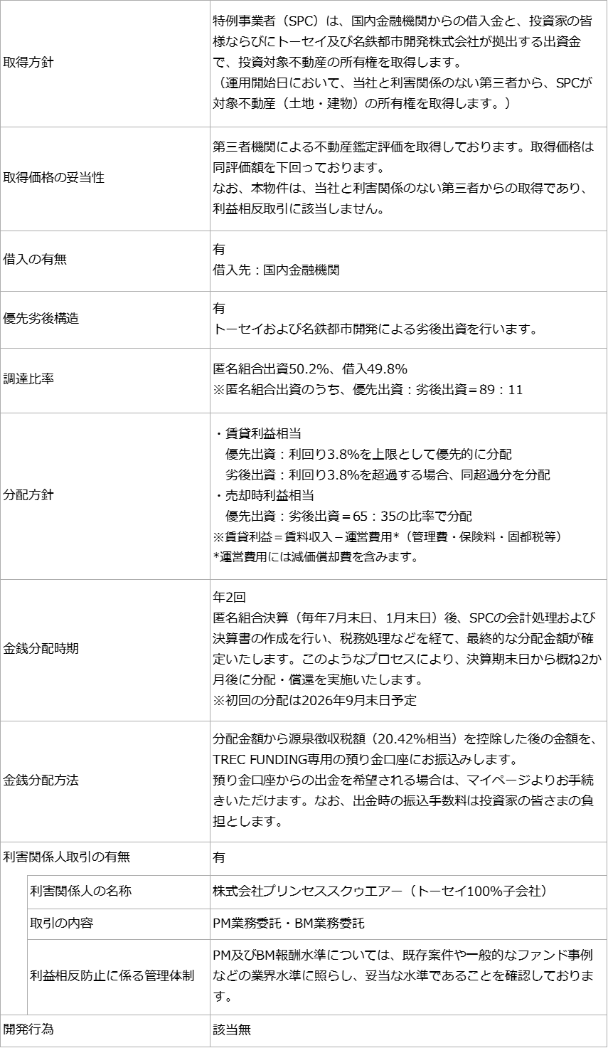 国内金融機関からの借入を活用することで、投資効率を相対的に高めております。また高い稼働率維持が見込まれ、安定した期中収益が期待できることから、期中想定利回り(賃貸収益相当)は3.8%(年率)を想定しております。 なお運用期間中は、物件運用状況の定期的な報告を通じ、透明性の確保に努めます。